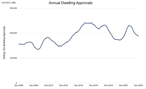 Building approvals figures are quite volatile, but looking through the noise annual approvals of below 190,000 and falling are the lowest in 24 months.
