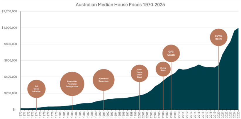 These forces do not resolve in a quarter. They compound over decades. This is why national house prices have more than tripled over the past 25 years despite recessions, pandemics, interest rate cycles and political upheaval.